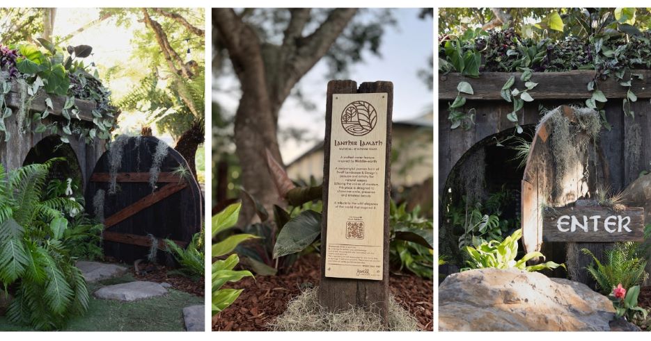 The planting brought the display to life. A careful cross section of mosses, ground cover, medium sized tropical plants, and established tree ferns that reached upward of 1 meter gave the effect of a canopied rainforest. Rare ferns, orchids, and collectors’ plants were sourced from personal collections and trusted suppliers, including dicksonia antarctica tree ferns and angiopteris evecta king ferns. Inside the hobbit house, the planting was styled after cenotes and living walls, with mosses, orchids, and Tillandsias cascading throughout the interior and along the roofline. By day, Lanthir Lamath had a cool, shaded gorge atmosphere, while at night the feature transformed with underwater lighting, pathway lighting made of aged timber bollards and hanging, century-old lanterns passed down through family.